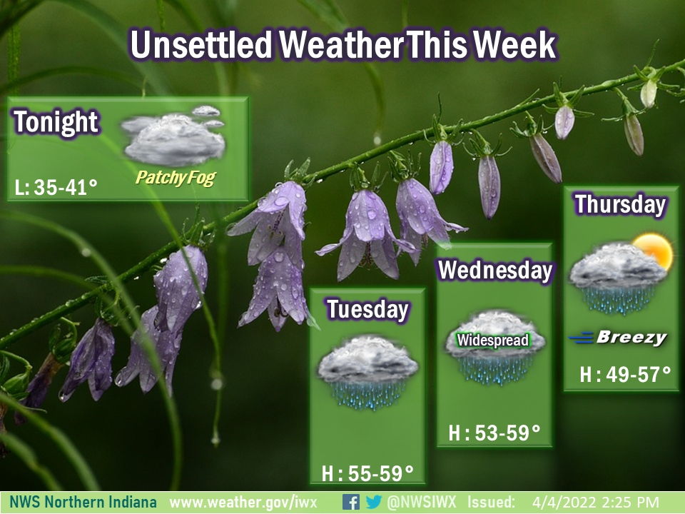 Fort Wayne, Indiana (April 4, 2022) – An active weather will bring periods of rain this week. Temperatures will be near normal with highs mostly in the 50s.